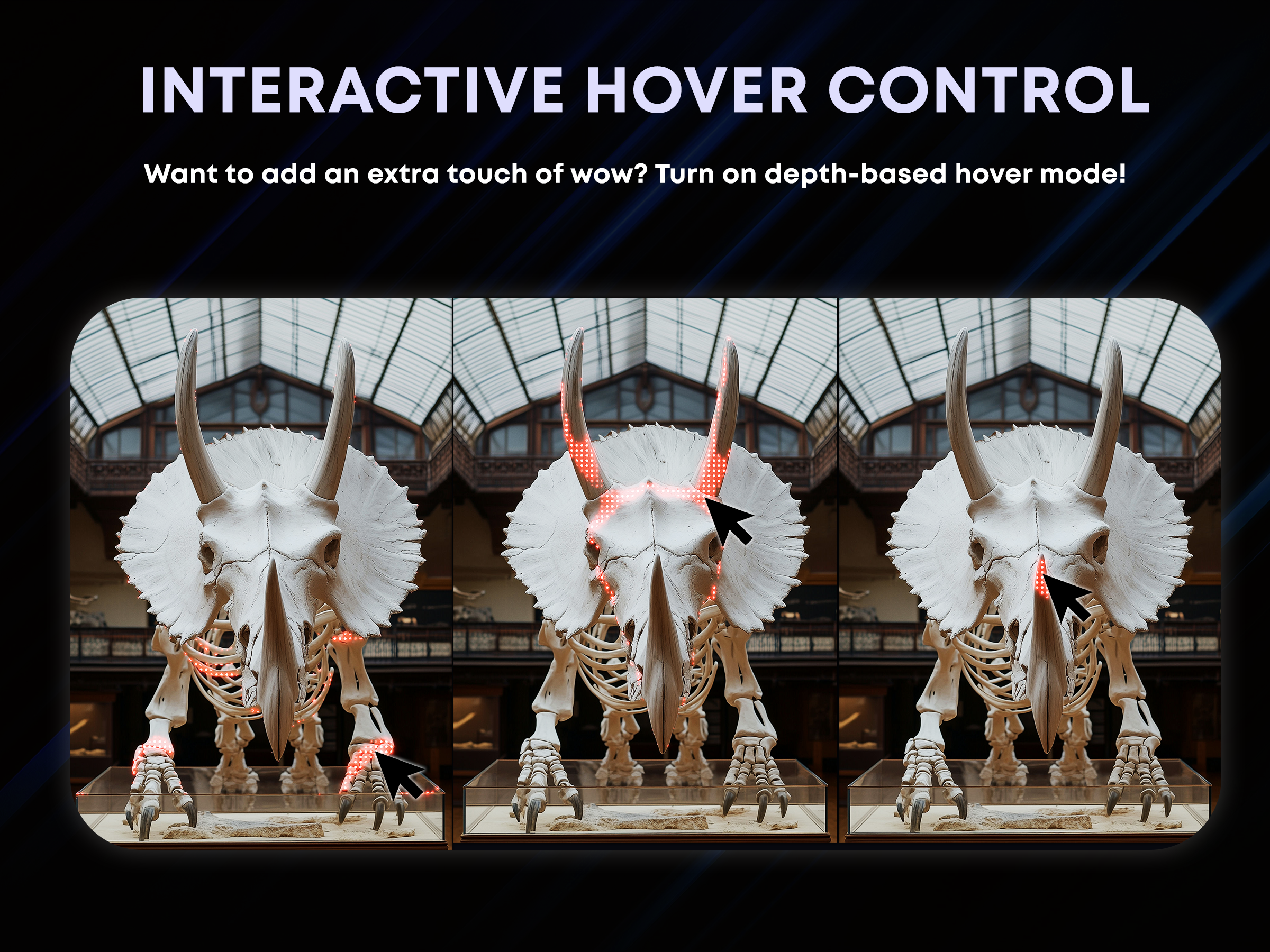 Real-Time 3D Parallax: mouse-responsive depth-based parallax creates immersive perspective shifts on hover