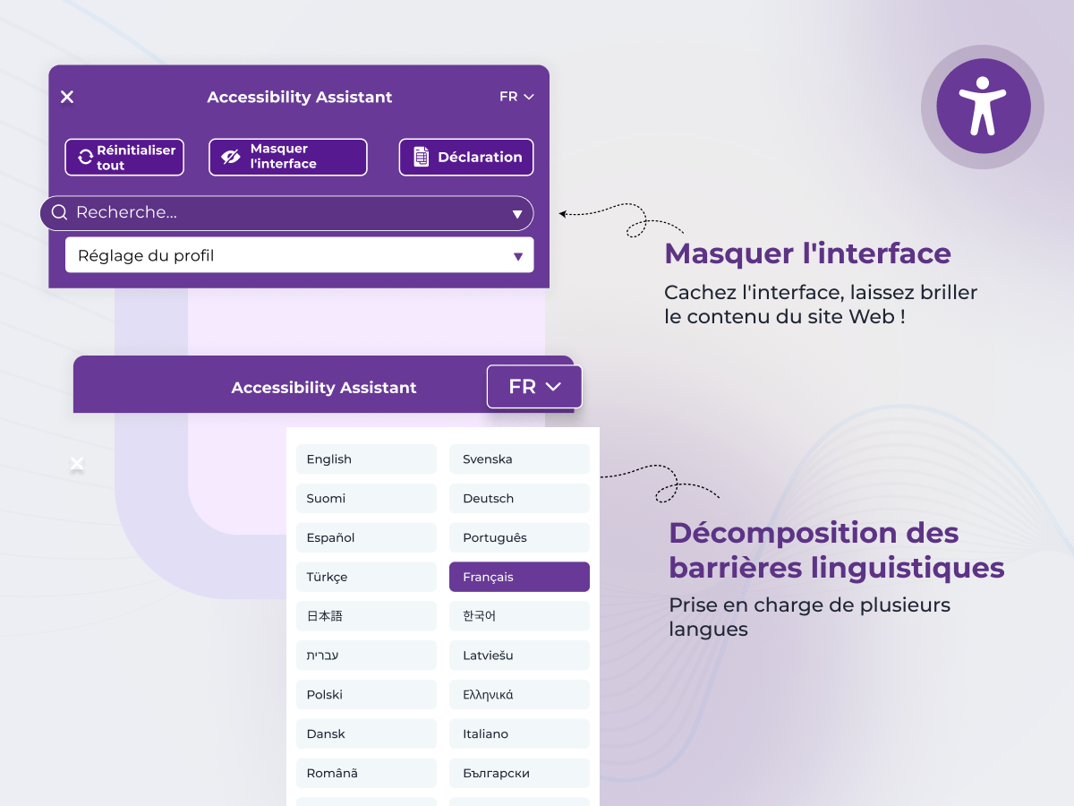 → Assurez la conformité ADA, WCAG, EAA et AODA en quelques clics, sans coder. L’Assistant d’Accessibilité ajoute un widget simple d’utilisation à votre site, permettant aux utilisateurs d’adapter l’interface à leurs besoins et d’améliorer l’expérience globale.