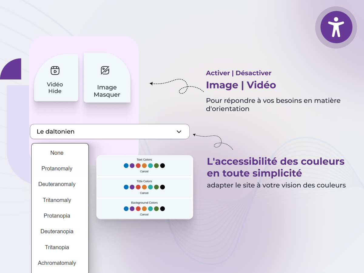 → Personnalisez l’apparence du widget : position, taille, couleurs, icônes. Activez ou désactivez les images, vidéos, GIFs et animations. Proposez la navigation clavier, un grand curseur, un raccourci vers le contenu, la mise en pause des animations, et des options d’échelle.