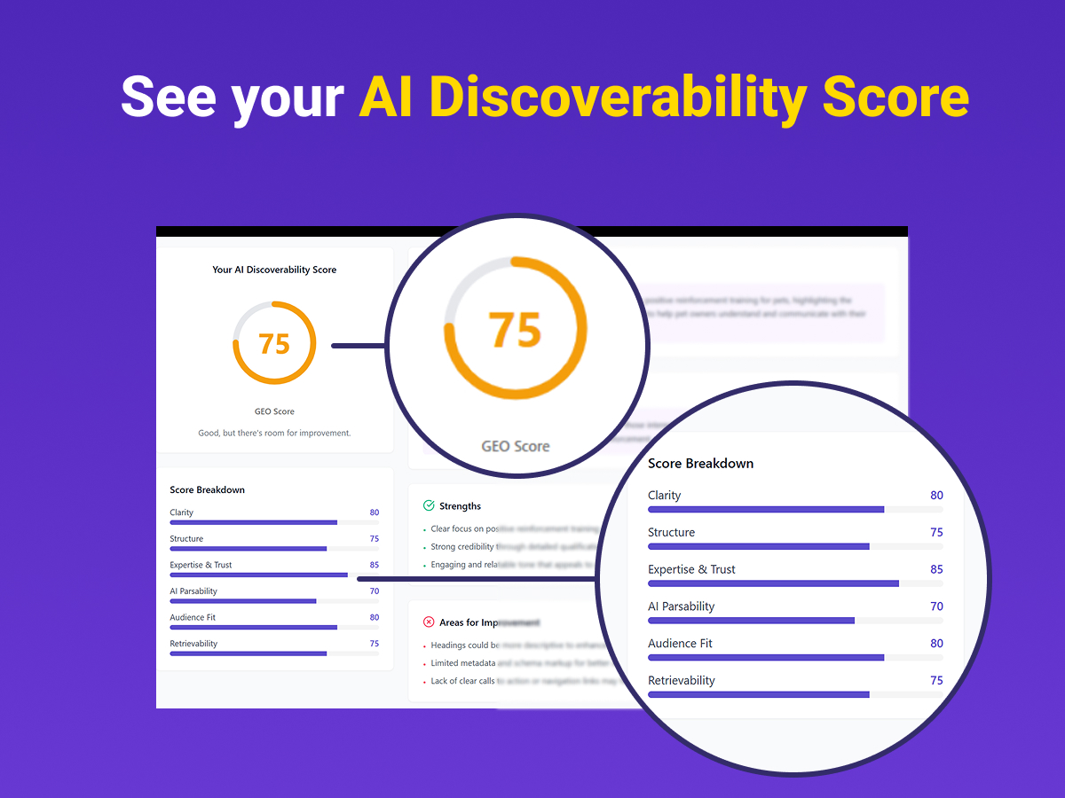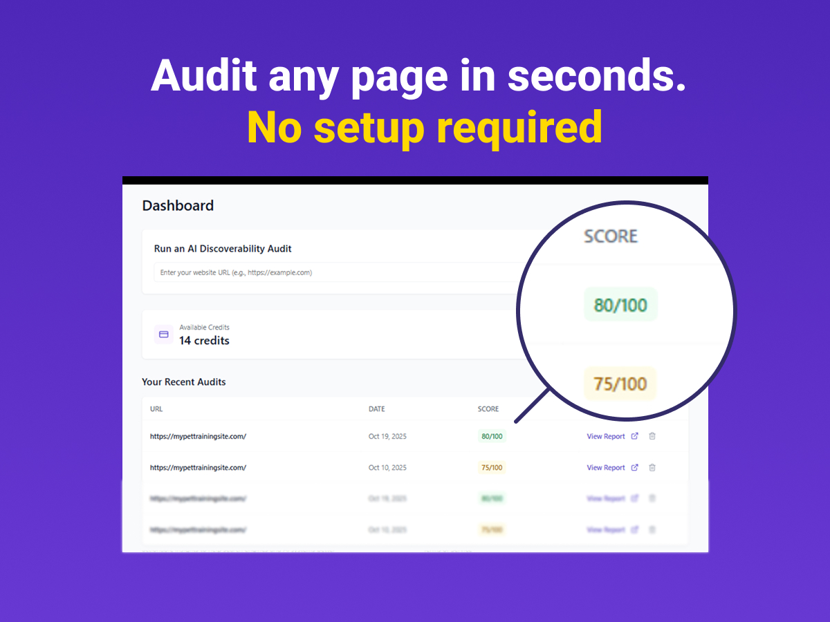 AI chatbots are quickly becoming the new search engines, but if they can’t understand your content, they can’t recommend you. AI Discoverability Audit shows exactly how one page of your site reads to AI assistants like ChatGPT, Perplexity, and Gemini, giving you an instant AI Discoverability Score (0–100) and a plain-language report explaining what AI gets right, what it misses, and how to fix it, with strengths and weaknesses analysis, concrete examples, step-by-step recommendations to improve visibility, and a free trial that includes one partial audit with no credit card required. Most websites aren’t written for AI comprehension yet, giving you a rare early-mover advantage, and this tool lets you see what AI actually understands about your content, track your progress as you improve, and stay visible as AI-driven discovery becomes the next wave of search. Thousands of business owners and creators are already optimizing for AI—make sure your site is one of them.