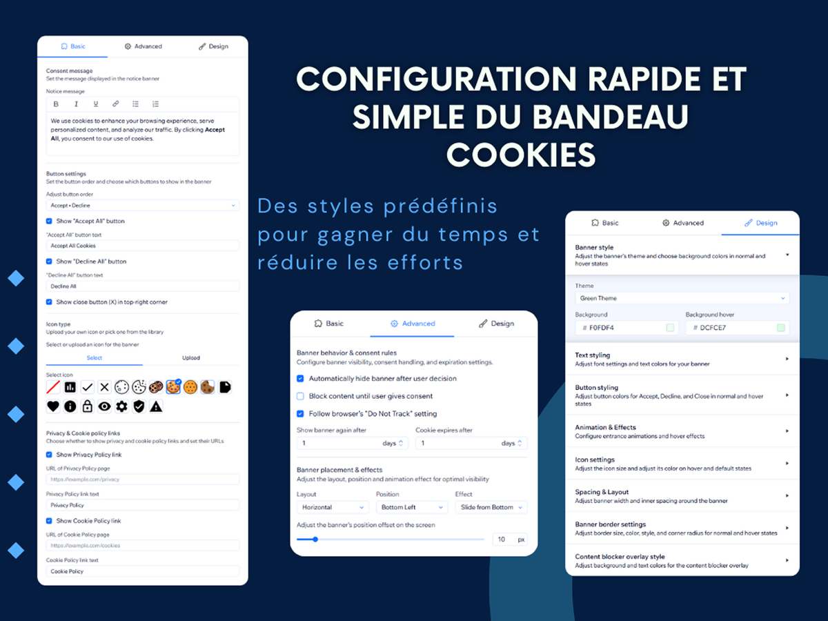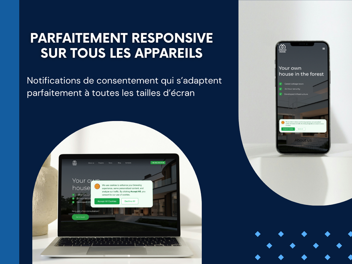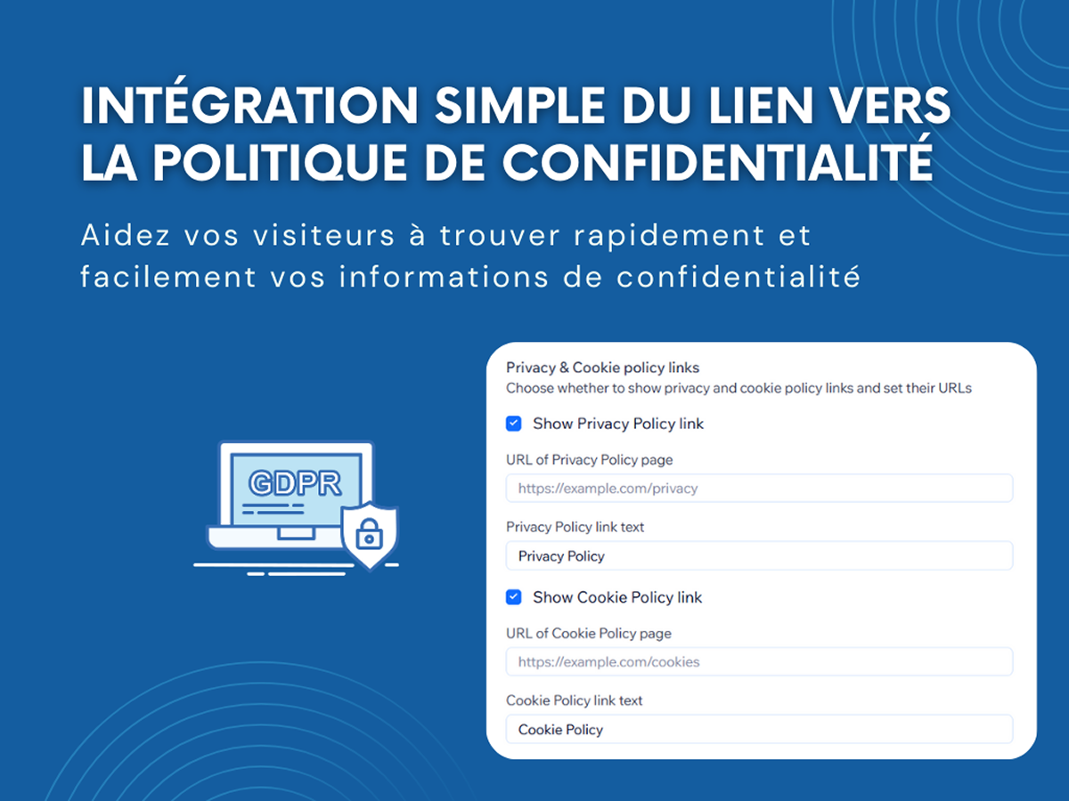 Affichez un bandeau cookies légal, un avis ou une popup de confidentialité qui informe clairement les utilisateurs sur l’utilisation des cookies et vous aide à collecter un consentement valide — sans aucune ligne de code.