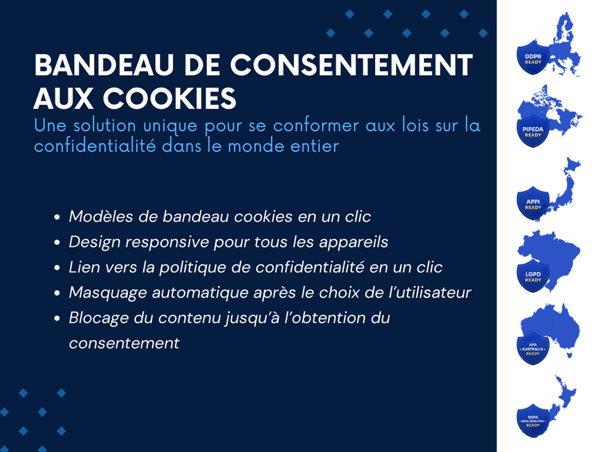 Rendez votre site conforme au RGPD, GDPR, CCPA, PIPEDA, APPI, LGPD, APA, NZPA ainsi qu’aux lois américaines sur la confidentialité en quelques minutes grâce à une solution de consentement aux cookies. Permettez aux visiteurs d’accepter, de refuser ou de gérer les cookies conformément aux réglementations en vigueur.