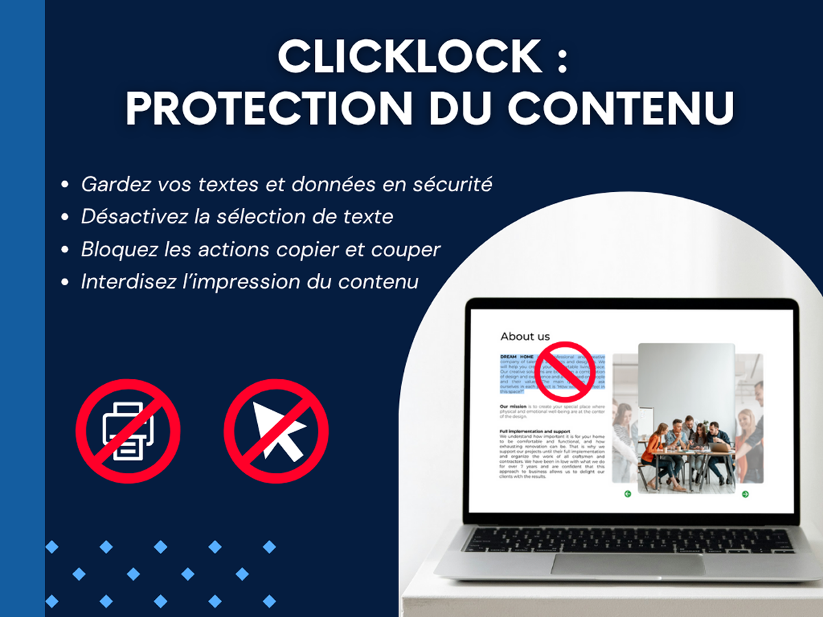 Elle empêche les visiteurs d’effectuer un clic droit, de copier du texte ou d’enregistrer des images, garantissant ainsi la sécurité de vos idées et créations.
