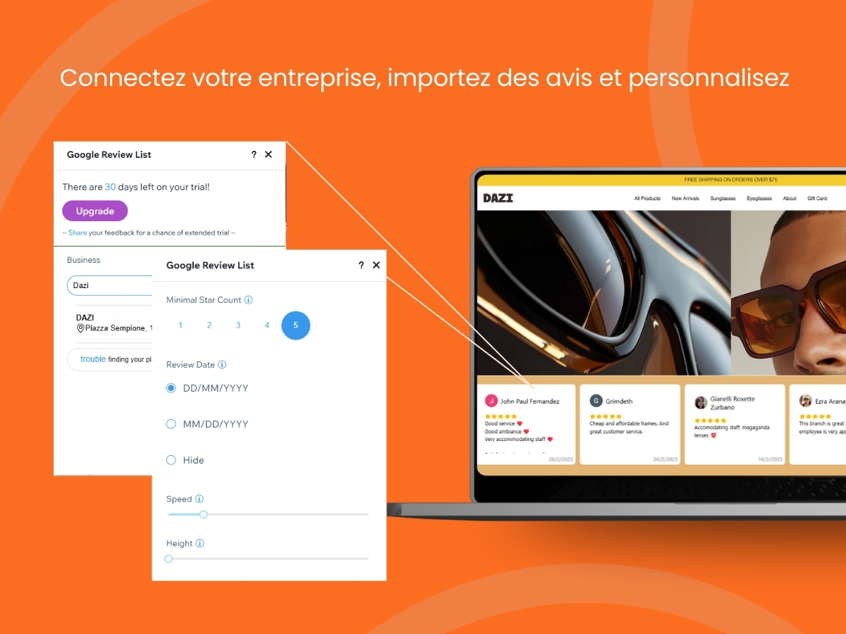Vous cherchez un moyen simple de présenter vos avis Google sur votre site web ? Notre application récupère vos meilleurs avis et propose un widget entièrement personnalisable, compatible avec tous les sites. Pas besoin de connecter un compte professionnel ni d'en créer un nouveau : il suffit de l'installer et de gagner la confiance de votre audience.