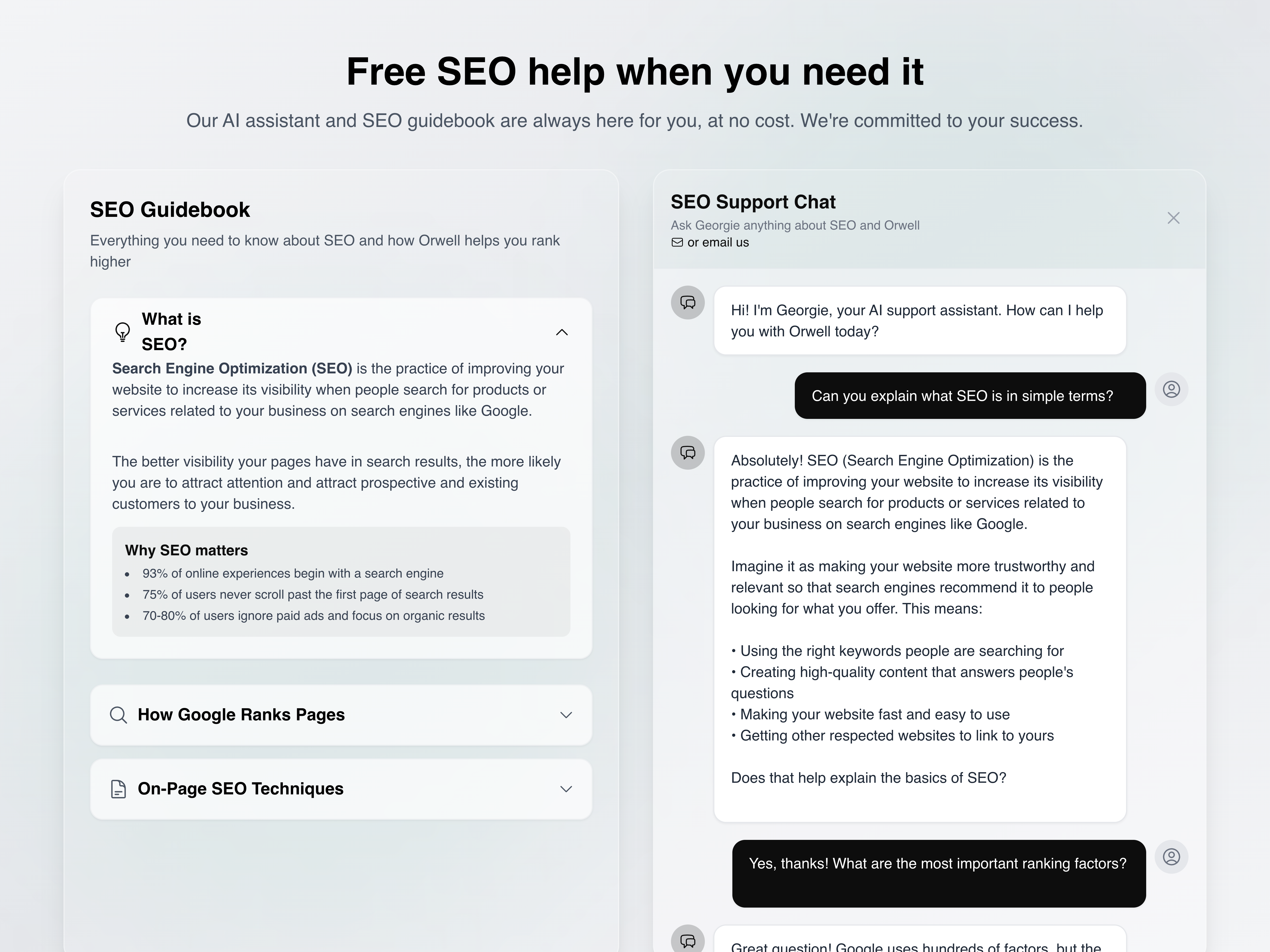 La plupart des blogs SEO échouent parce qu'ils ne construisent pas la confiance. Ils sont précipités, déconnectés de l'intention de l'utilisateur et deviennent rapidement obsolètes. Mais la confiance est ce qui génère les conversions—et la confiance vient de la pertinence, de la profondeur et de l'autorité. Cela nécessite une recherche sérieuse. Orwell résout cela, rapidement.