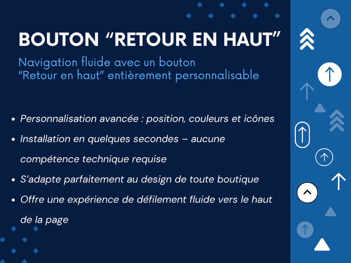 Améliorez l’expérience utilisateur de votre site avec un bouton “Retour en haut” entièrement personnalisable – idéal pour les pages longues et la navigation mobile.